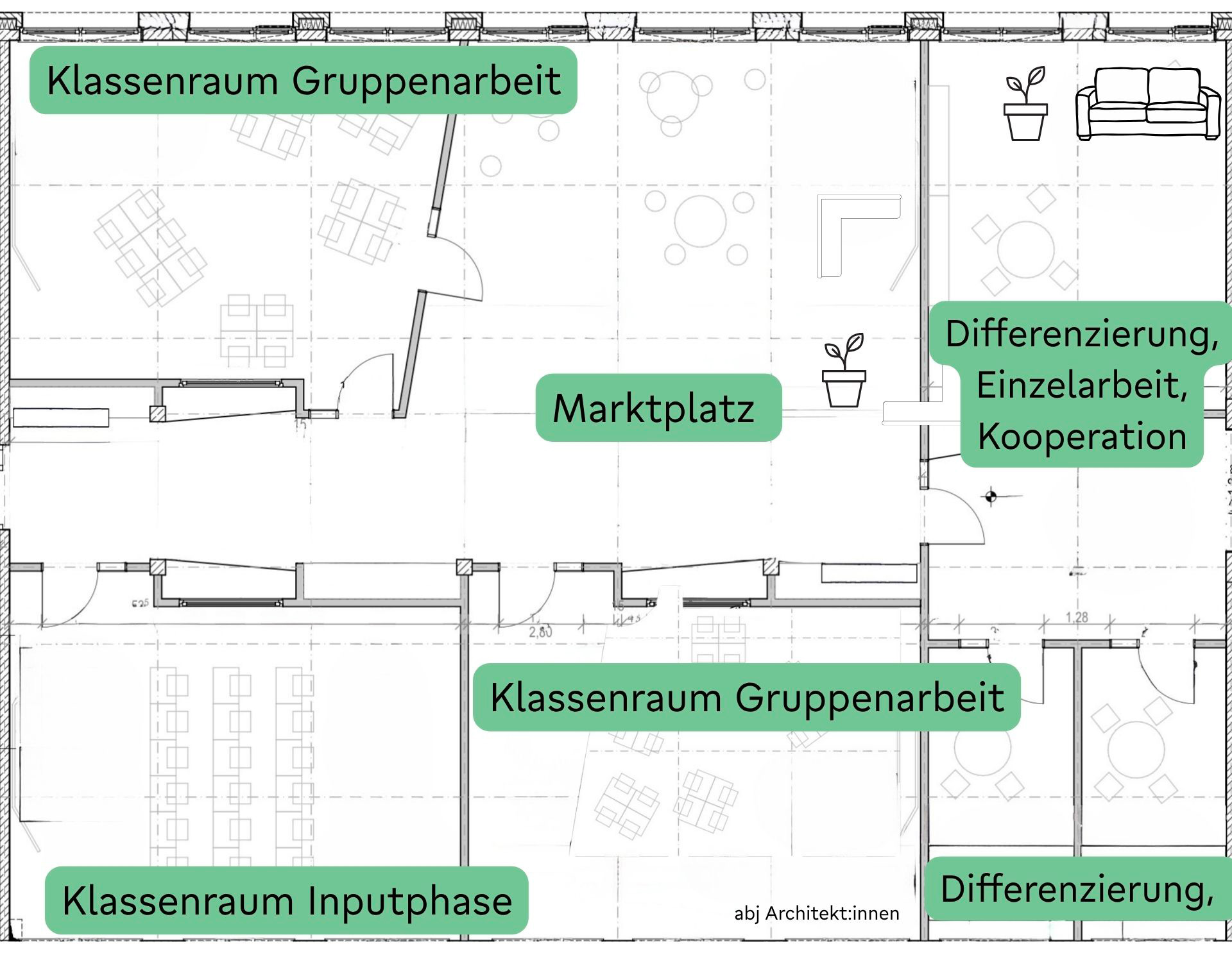 Das Zentrum eines Clusters ist der Marktplatz. Dessen Freifläche bietet viel Platz für das kooperative Lernen in kleineren und größeren Teams. Darum gruppieren sich Unterrichtsräume für das gemeinsame Lernen in der Klasse und kleinere Räume für die Differenzierung und Einzelarbeit. Klassenräume werden mit flexiblem Mobiliar ausgestattet, das für alle denkbaren Unterrichts- und Sozialformen schnell umgestellt werden kann.
